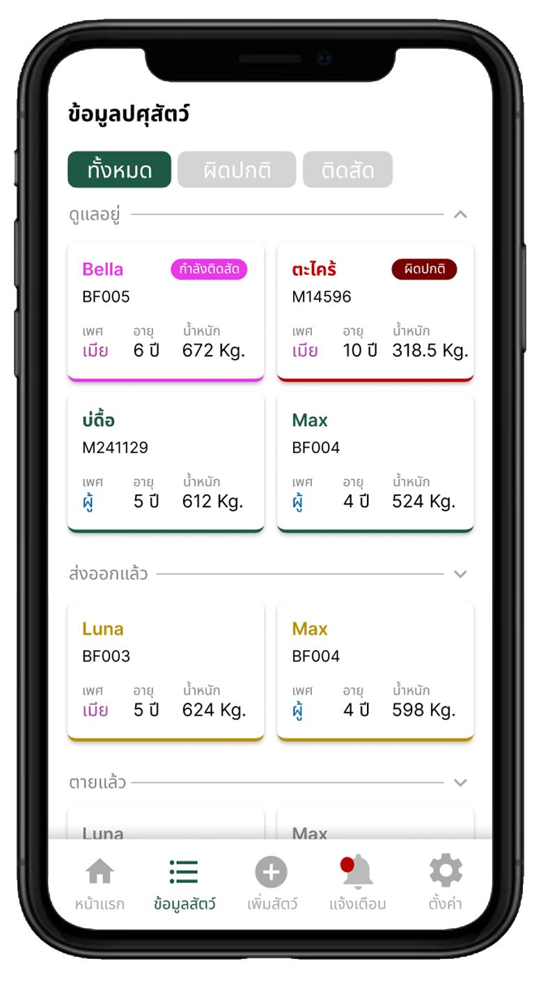 หน้ารวมรายการสัตว์ทั้งหมดที่เราบันทึกไว้ ที่จะกำกับด้วยสี แสดงถึงสถาณะและความผิดปกติต่างๆ